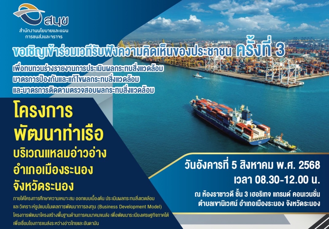 กลุ่มพัฒนาและส่งเสริมการขนส่งสินค้า เปิดเผยร่างรายงานการประเมินผลกระทบสิ่งแวดล้อมฯ โครงการพัฒนาท่าเรือบริเวณแหลมอ่าวอ่าง อ.เมืองระนอง จ.ระนอง 29 ก.ค. 2568