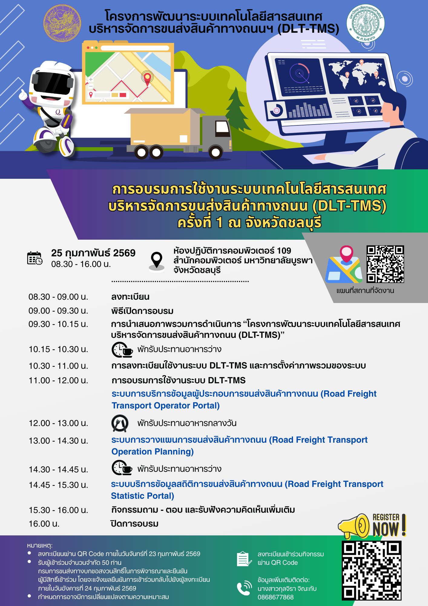 สำนักการขนส่งสินค้า กรมการขนส่งทางบก ขอเชิญเข้าร่วมการอบรมการใช้งานระบบเทคโนโลยีสารสนเทศบริหารจัดการขนส่งสินค้าทางถนน (DLT-TMS) ครั้งที่ 1 ในวันพุธที่ 25 กุมภาพันธ์ 2569 เวลา 08.30 - 16.00 น. ณ  ห้องปฏิบัติการคอมพิวเตอร์ 109 สำนักคอมพิวเตอร์ มหาวิทยาลัยบูรพา จังหวัดชลบุรี เพื่อให้ผู้ประกอบการขนส่งสินค้ามีความรู้ความเข้าใจและสามารถใช้งานระบบ DLT-TMS ได้อย่างเต็มประสิทธิภาพ สอดคล้องกับบริบทในการประกอบธุรกิจ