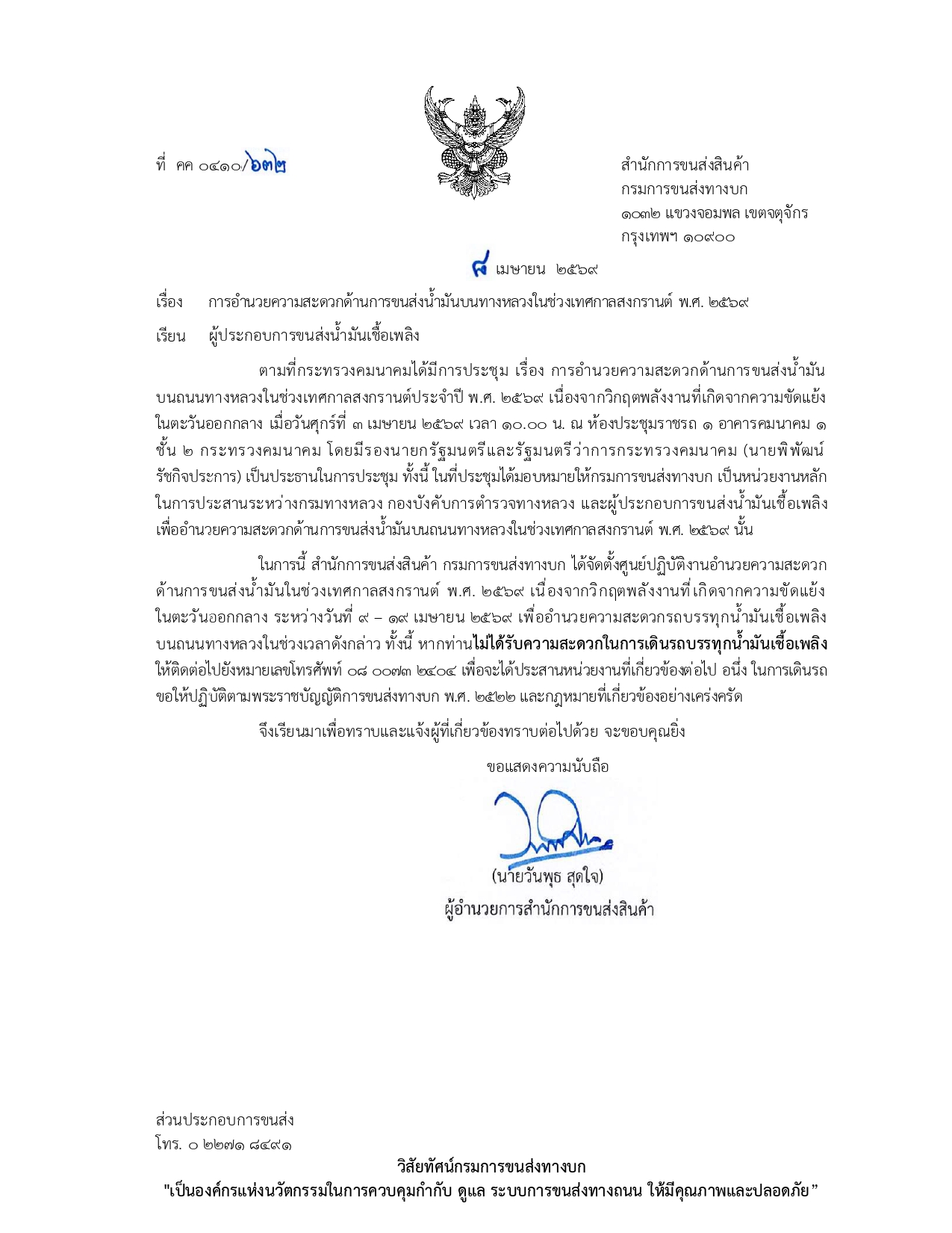 เพื่ออำนวยความสะดวกด้านการขนส่งน้ำมันบนถนนทางหลวงในช่วงเทศกาลสงกรานต์ พ.ศ. 2569 นั้น