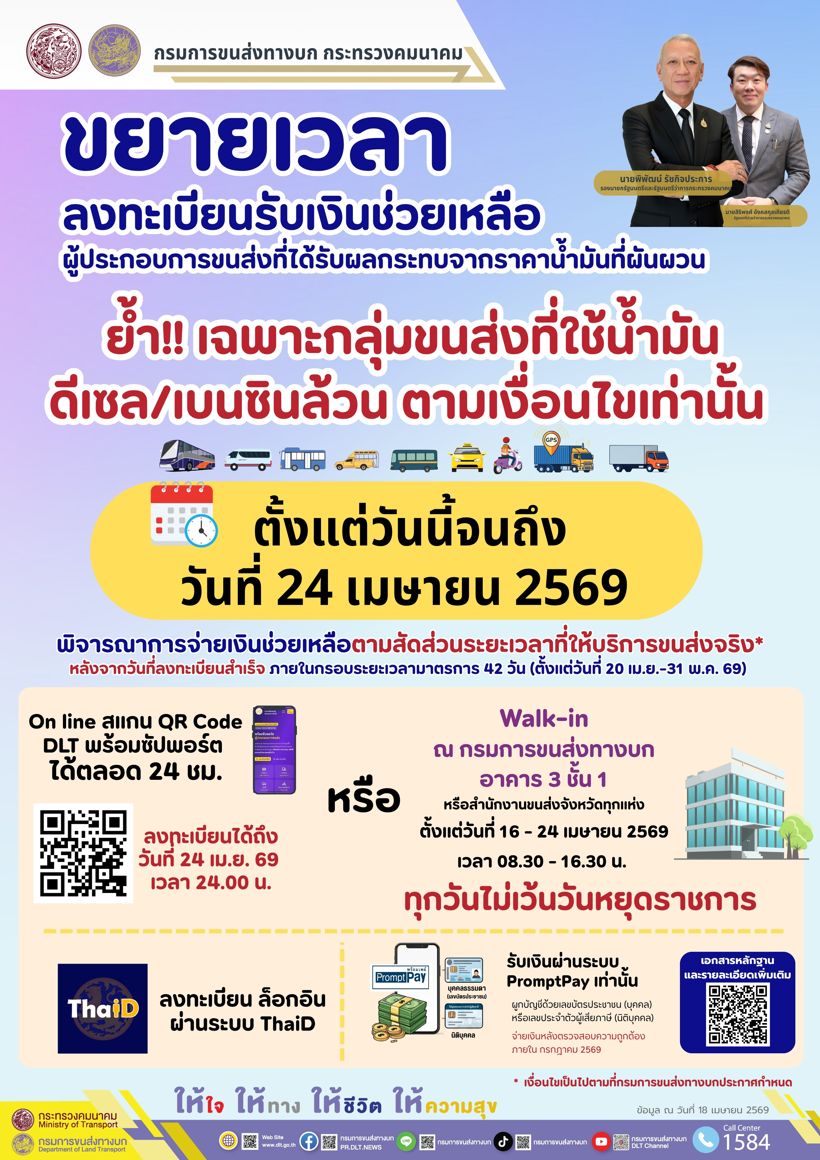 กระทรวงคมนาคม กรมการขนส่งทางบก ขยายเวลาลงทะเบียนรับเงินช่วยเหลือ “กลุ่มขนส่งที่ใช้น้ำมันดีเซลหรือเบนซินล้วน” อุ้มผู้ประกอบการขนส่ง-ลดภาระค่าครองชีพประชาชน รับมือวิกฤตน้ำมัน โดยสามารถลงทะเบียนผ่านระบบ “DLT พร้อมซัปพอร์ต” ตั้งแต่วันนี้ถึงวันที่ 24 เม.ย. 69 (ไม่เว้นวันหยุดราชการ)