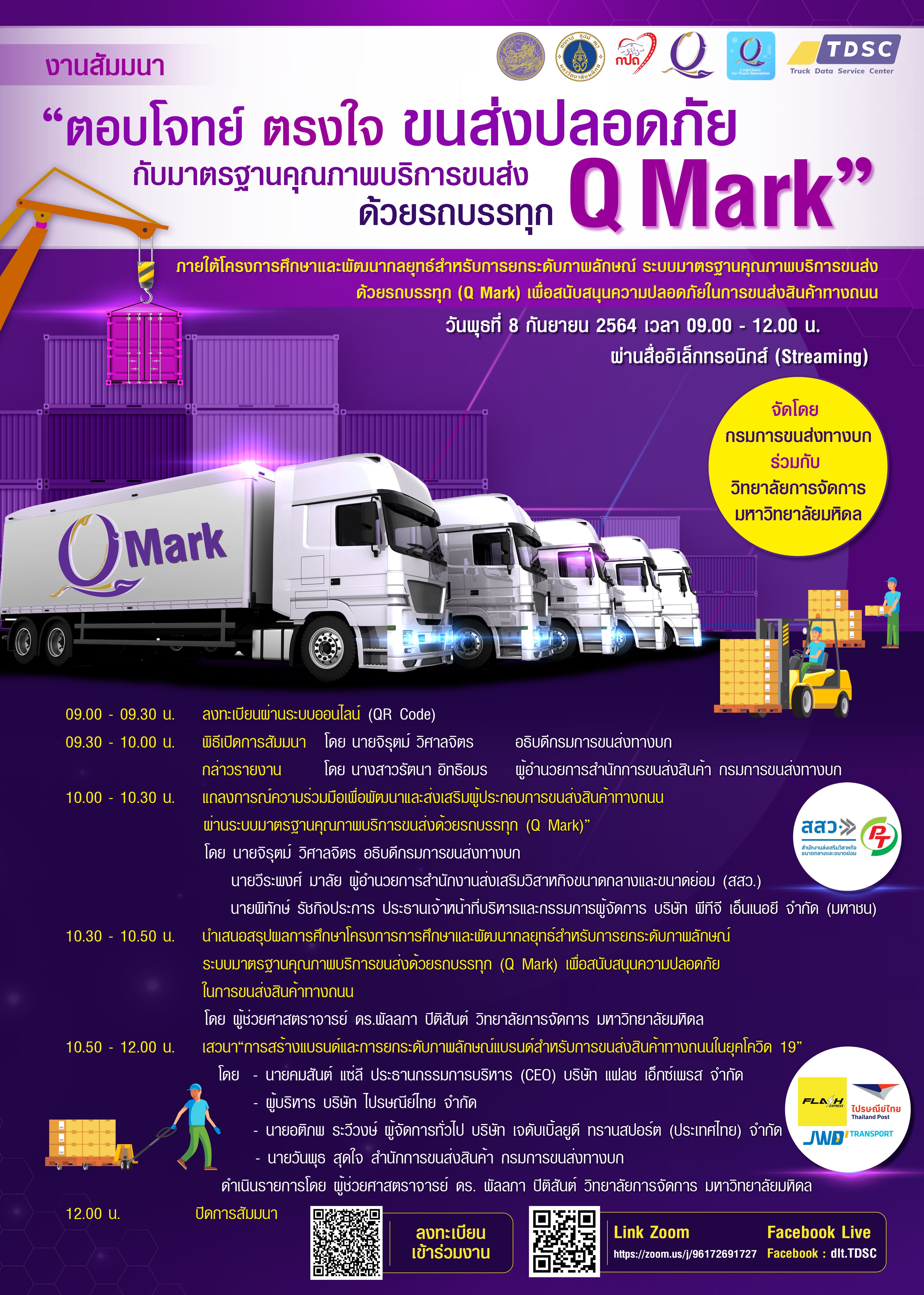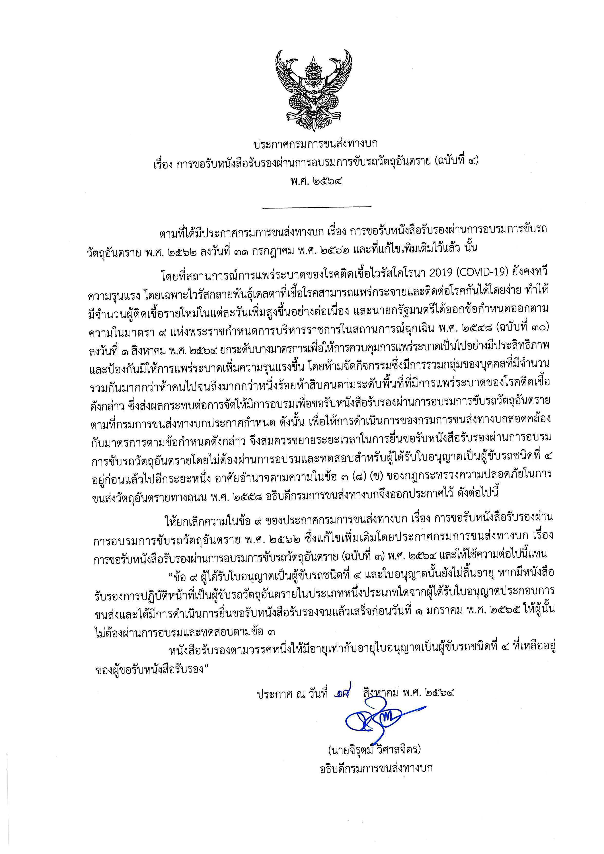ประกาศกรมการขนส่งทางบก เรื่อง การขอรับรองผ่านการอบรมการขับรถวัตถุอันตราย (ฉบับที่ 4) พ.ศ.2564 >> ดาวน์โหลดคลิก << ข่าวก่อนหน้า คำสั่ง ขบ. เรื่อง ปรับปรุงมาตราการการให้บริการรถโดยสารสาธารณะ และการขนส่งสินค้าตามข้อกำหนดออกตามความในมาตรา 9 แห่งพระราชกำหนดฯ ข่าวถัดไป ขอเชิญร่วมงานสัมมนา "ตอบโจทย์ ตรงใจ ขนส่งปลอดภัย กับมาตรฐานคุณภาพบริการขนส่งด้วยรถบรรทุก Q Mark" ประชาสัมพันธ์ล่าสุด 21 ต.ค. 2568 ขอความอนุเคราะห์ ตอบแบบสอบถามการมีและการใช้มาตรฐานทางจริยธรรมของกรมการขนส่งทางบก 15 ต.ค. 2568 ระบบแจ้งเตือนการกระทำความผิดแก่ผู้ประกอบการเดินรถแบบอัตโนมัติ (GPS Notice) 8 ต.ค. 2568 ขอเชิญผู้ประกอบการขนส่งเข้าร่วมการประชุมเชิงปฏิบัติการเพื่อทดสอบและนำร่องการใช้งานระบบ DLT-TMS ครั้งที่ 4 30 ก.ย. 2568 ขอเชิญผู้ประกอบการขนส่งเข้าร่วมการประชุมเชิงปฏิบัติการเพื่อทดสอบและนำร่องการใช้งานระบบ DLT-TMS ครั้งที่ 3