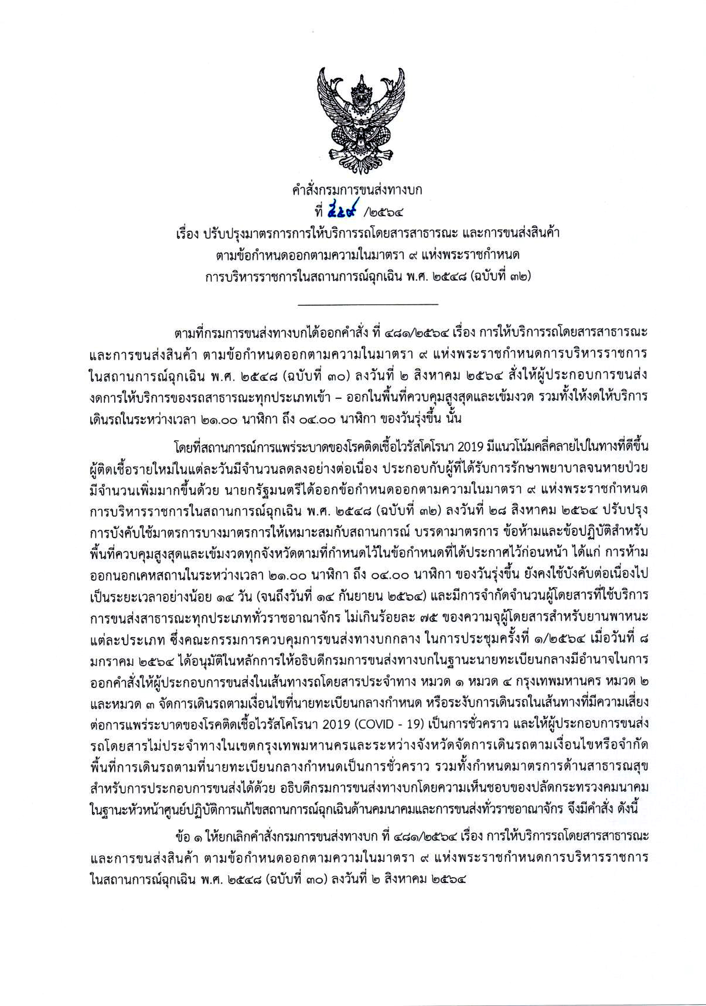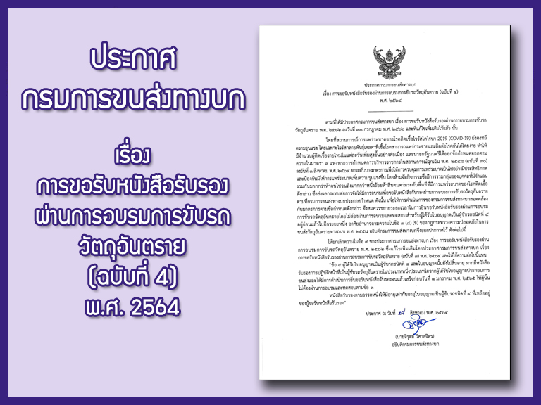 คำสั่ง ขบ. เรื่อง ปรับปรุงมาตราการการให้บริการรถโดยสารสาธารณะ และการขนส่งสินค้าตามข้อกำหนดออกตามความในมาตรา 9 แห่งพระราชกำหนดฯ >> ดาวน์โหลดเพิ่มเติมคลิก <<Link : https://bit.ly/3jxb2g2 ข่าวก่อนหน้า กิจกรรมการประกวดตั้งชื่อและออกแบบโลโก้ (LOGO) เว็บไซต์ด้านความปลอดภัยในการใช้รถใช้ถนน ข่าวถัดไป ประกาศกรมการขนส่งทางบก เรื่อง การขอรับรองผ่านการอบรมการขับรถวัตถุอันตราย (ฉบับที่ 4) พ.ศ.2564 ประชาสัมพันธ์ล่าสุด 21 ต.ค. 2568 ขอความอนุเคราะห์ ตอบแบบสอบถามการมีและการใช้มาตรฐานทางจริยธรรมของกรมการขนส่งทางบก 15 ต.ค. 2568 ระบบแจ้งเตือนการกระทำความผิดแก่ผู้ประกอบการเดินรถแบบอัตโนมัติ (GPS Notice) 8 ต.ค. 2568 ขอเชิญผู้ประกอบการขนส่งเข้าร่วมการประชุมเชิงปฏิบัติการเพื่อทดสอบและนำร่องการใช้งานระบบ DLT-TMS ครั้งที่ 4 30 ก.ย. 2568 ขอเชิญผู้ประกอบการขนส่งเข้าร่วมการประชุมเชิงปฏิบัติการเพื่อทดสอบและนำร่องการใช้งานระบบ DLT-TMS ครั้งที่ 3