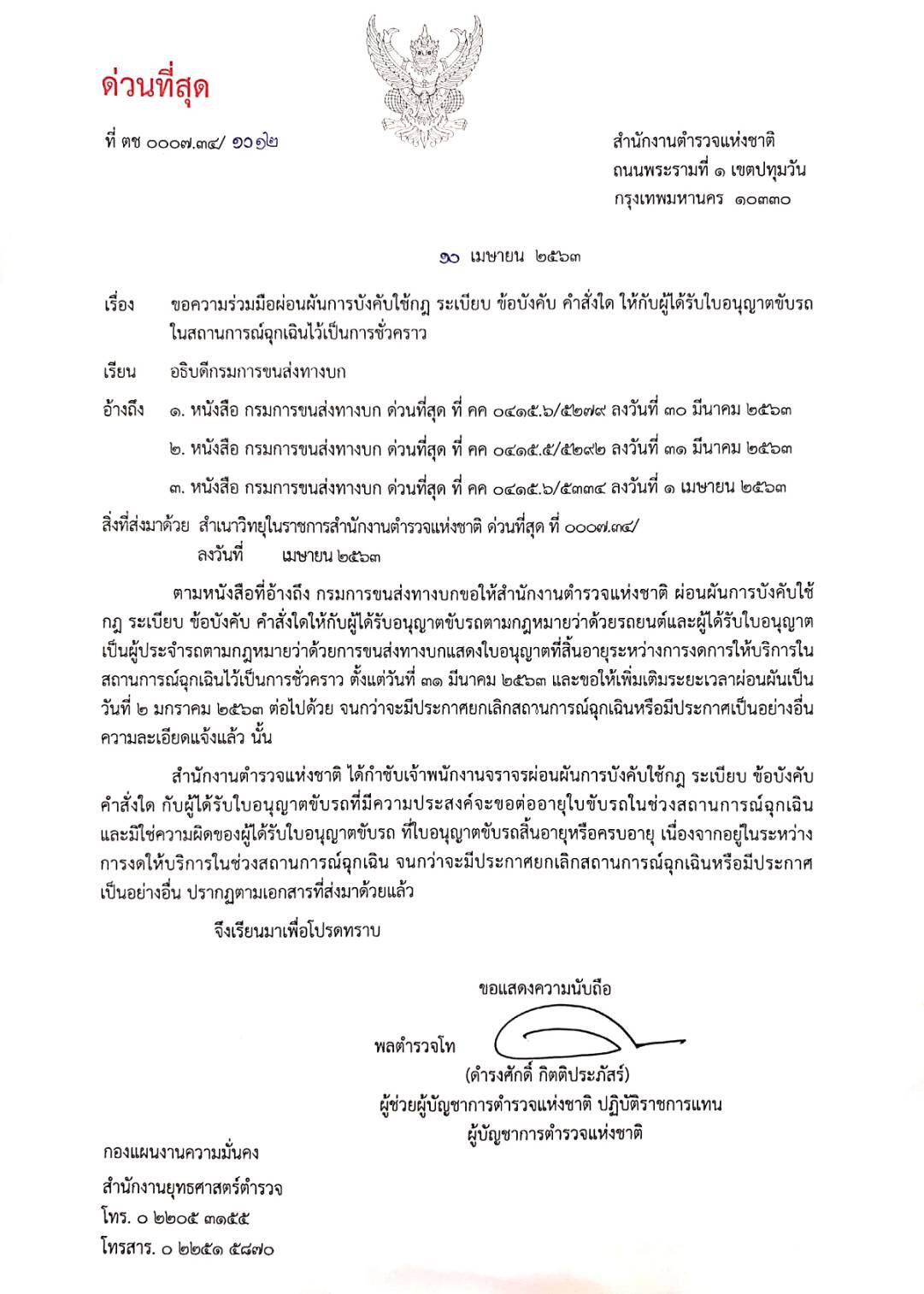 สำนักงานตำรวจแห่งชาติ ได้กำชับเจ้าพนักงานจราจรผ่อนผันการบังคับใช้ กฎ ระเบียบ ข้อบังคับ คำสั่งใด กับผู้ได้รับใบอนุญาตขับรถที่มีความประสงค์จะขอต่ออายุใบขับรถในช่วงสถานการณ์ฉุกเฉินและมิใช่ความผิดของผู้ได้รับใบอนุญาตขับรถ ที่ใบอนุญาตขับรถสิ้นอายุหรือครบอายุ เนื่องจากอยู่ในระหว่างการงดให้บริการในช่วงสถานการณ์ฉุกเฉิน จนกว่าจะมีประกาศยกเลิกสถานการณ์ฉุกเฉินหรือมีประกาศเป็นอย่างอื่น ปรากฏตามเอกสารที่ส่งมาด้วยแล้ว
