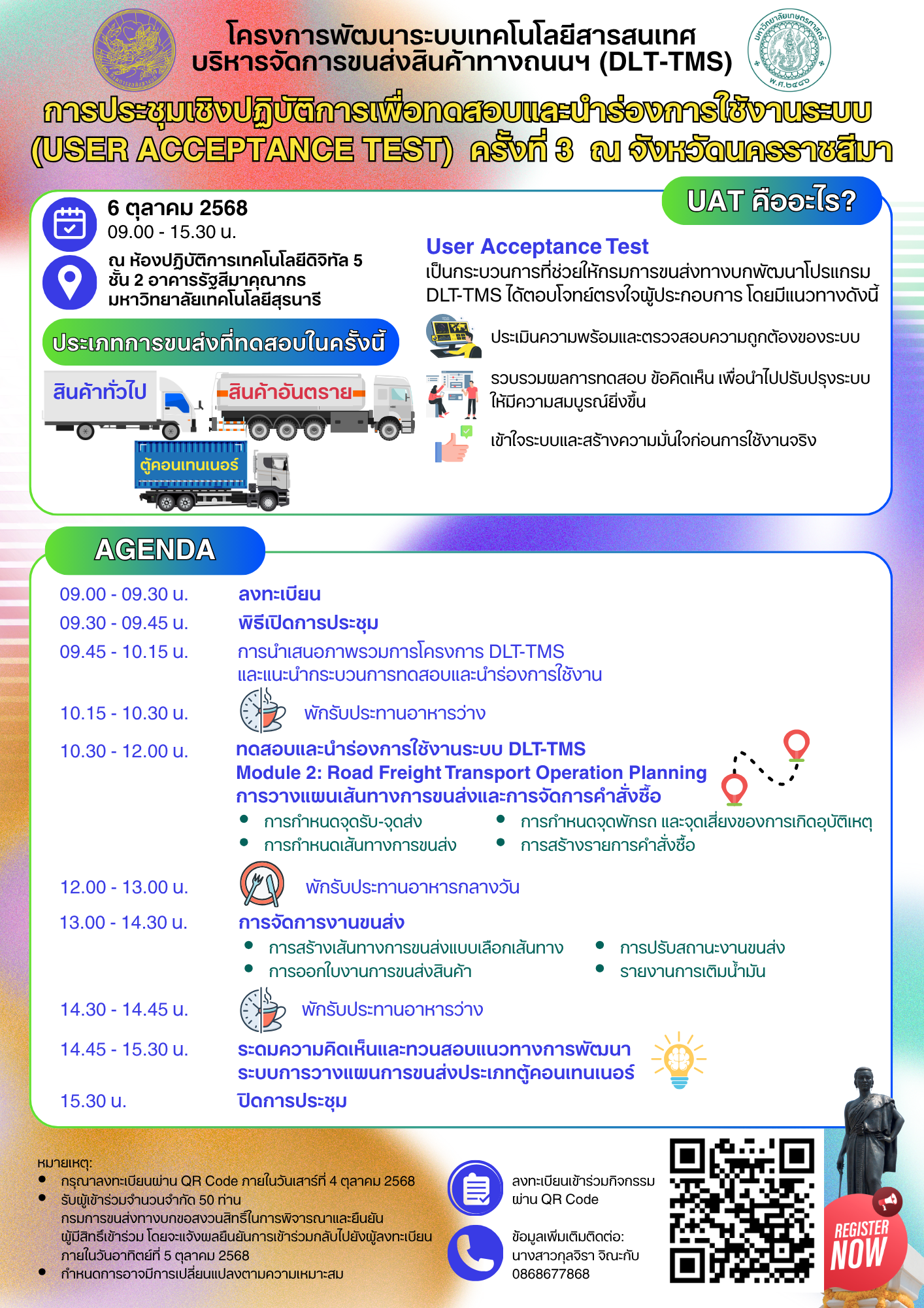 ด้วยกรมการขนส่งทางบกได้ดำเนินโครงการพัฒนาระบบเทคโนโลยีสารสนเทศบริหารจัดการขนส่งสินค้าทางถนน เพื่อช่วยสนับสนุนและยกระดับมาตรฐานผู้ประกอบการขนส่งสินค้าทางถนนของประเทศไทย (DLT-TMS) ซึ่งภายใต้โครงการดังกล่าวกำหนดให้มีการจัดการประชุมเชิงปฏิบัติการเพื่อทดสอบและนำร่องการใช้งานระบบเทคโนโลยีสารสนเทศบริหารจัดการขนส่งสินค้าทางถนน (DLT-TMS User Acceptance Test) ครั้งที่ 3 ในวันจันทร์ที่ 6 ตุลาคม 2568 เวลา 09.00 – 15.30 น. ณ ห้องปฏิบัติการเทคโนโลยีดิจิทัล 5 ชั้น 2 อาคารรัฐสีมาคุณากร มหาวิทยาลัยเทคโนโลยีสุรนารี จังหวัดนครราชสีมา