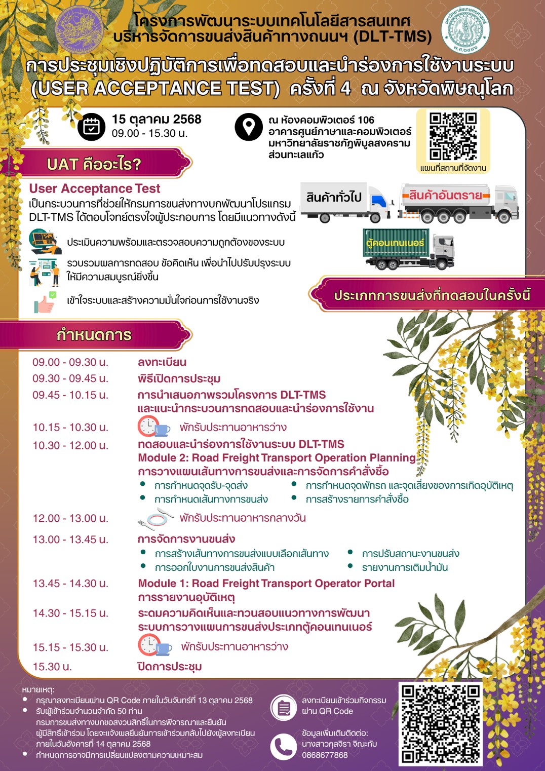 ด้วยกรมการขนส่งทางบกได้ดำเนินโครงการพัฒนาระบบเทคโนโลยีสารสนเทศบริหารจัดการขนส่งสินค้าทางถนน เพื่อช่วยสนับสนุนและยกระดับมาตรฐานผู้ประกอบการขนส่งสินค้าทางถนนของประเทศไทย (DLT-TMS) ซึ่งภายใต้โครงการดังกล่าวกำหนดให้มีการจัดการประชุมเชิงปฏิบัติการเพื่อทดสอบและนำร่องการใช้งานระบบเทคโนโลยีสารสนเทศบริหารจัดการขนส่งสินค้าทางถนน (DLT-TMS User Acceptance Test) ครั้งที่ 4 ในวันพุธที่ 15 ตุลาคม 2568 เวลา 09.00 – 15.30 น. ณ ห้องคอมพิวเตอร์ 106 อาคารศูนย์ภาษาและคอมพิวเตอร์ มหาวิทยาลัยราชภัฎพิบูลสงคราม ส่วนทะเลแก้ว จังหวัดพิษณุโลก