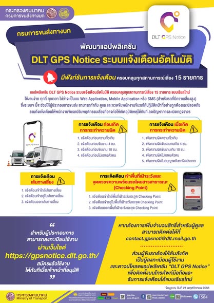 สำนักการขนส่งสินค้า ประชาสัมพันธ์การให้บริการระบบ DLT GPS Notice รายละเอียดปรากฏตามภาพแนบ